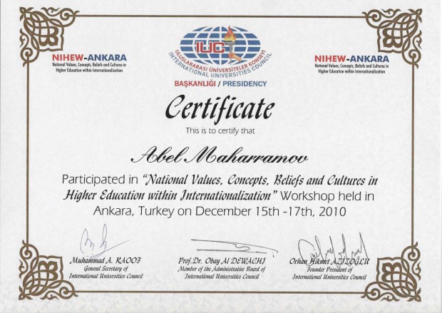 Ректор Бакинского государственного университета (БГУ) академик Абель Магеррамов удостоен сертификата семинара Международного совета университетов, прошедший в Анкаре. Сертификат семинара на тему «Национальные ценности, концепции, вера и культура высшего образования в рамках общечеловеческих ценностей» вручен Генеральным секретарем Международного совета университетов Мухаммед A.Рауфом, членом правления профессором др. Обай Ал Девачи и президентом структуры Орханом Хикмет Азизоглу.