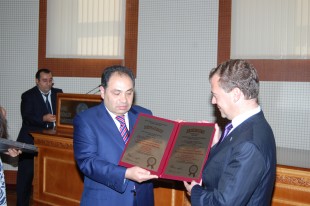 Абель Магеррамов отметил и то, что за девяностолетнюю историю БГУ его выпускниками были многие знаменитые люди, известные ученые. В числе всемирно известных почетных докторов университета можно назвать таких выдающихся личностей современности, как общенациональный лидер азербайджанского народа Гейдар Алиев, бывший советник по национальной безопасности президента США Збигнев Бжезинский, президент Турции Абдуллах Гюль, ректор МГУ Виктор Садовничий и многих других видных государственных и общественных деятелей, именитых ученых из различных стран мира. Знаменательно, что в последний раз члены Ученого совета БГУ собирались на такую торжественную церемонию в связи с присуждением звания почетного доктора БГУ президенту Азербайджана Ильхаму Алиеву. Абель Магеррамов отметил, что президенту Дмитрию Медведеву не понаслышке известны проблемы и трудности, переживаемые системой образования. Как бывший вузовский преподаватель, президент РФ прилагает все усилия для совершенствования этой системы, улучшения качества и повышения уровня образования. Учитывая личный вклад президента Дмитрия Медведева в дело укрепления единого гуманитарного пространства и активное участие в расширении контактов в сфере науки и образования, укрепление дружбы и братства между Россией и Азербайджаном, Ученый Совет БГУ принял решение о присвоении ему звания Почетного доктора БГУ. В связи с этим Абель Магеррамов поздравил президента России, вручив ему диплом и атрибуты Почетного доктора БГУ.